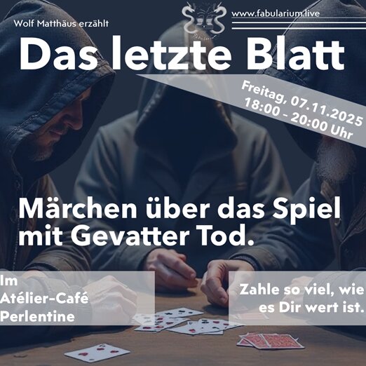 Der Märchenerzähler Wolf Matthäus erzählt frei Märchen und Geschichten über Menschen, die sich dem Sensenmann nicht einfach hingeben. Es geht um Tricksereien und Glücksspiel. Und mit viel Augenzwinkern stellt sich am Ende die Frage: ist der Tod nicht auch nur ein Mensch?