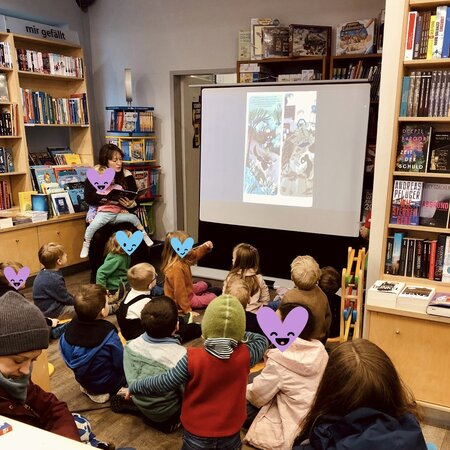Die Bilder zur Geschichte projizieren wir auf eine kleine Leinwand im Laden, ein echtes Bilderbuchkino eben!